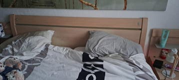 2 persoonsbed alleen de bedombouw met nachtkastjes heeft een krasje, zie foto zonder bedbodem of matrassen ,beddengoed of dekbed. Vanaf vrijdag 3 april 2026