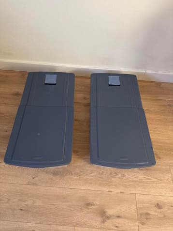 Twee opbergbakken met deksel. Ze zien er nog prima uit. Van één bak mist één wieltje. De bakken zijn 15,5 cm hoog en 78 cm lang. Komen uit een rookvrij en diervrij huis.