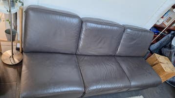 Lengte*hoogte*diepte 208*84*92cm zithoogte 42cm zitdiepte 55cm. In 2 stukken deelbaar, zitten nu vast. Leer is nog in goede kwaliteit.