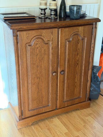 Mooi houten kastje met twee deuren en drie handige planken. Ideaal voor extra opbergruimte in elke kamer. Het kastje is 99 cm breed, 49 cm diep en 115 cm hoog. Het verkeert in goede, gebruikte staat e