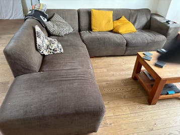 Deze grote hoekbank is donkerbruin van kleur. De bank heeft een lange chaise longue aan de rechterkant. Er passen makkelijk meerdere mensen op.