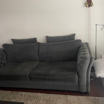 Grijze bank van 220 meter lang en 1 meter breed. De zitkussens zijn nog stevig, zelfs goed om op te slapen. De rugkussens zakken wel beetje in als je langer zit. Slijtage op 1 hoekje (zie foto 2), ver