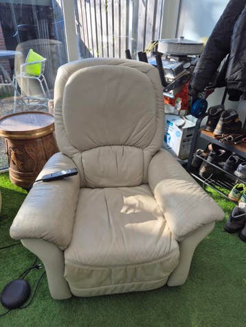 Comfortabele sta-op / lig stoel van himolla, uitgevoerd in crème leer. Ideaal voor mensen die moeite hebben met opstaan. De stoel is gebruikt, en in redelijke staat en werkt naar behoren. Voorzien van