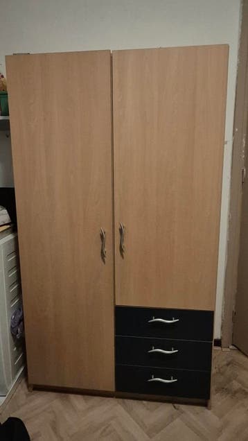 Kleur kast is beuken, twee deuren, meerdere planken aan beide kanten en drie lades rechtsonder. Foto's zijn in de avond genomen, de lades zijn echt blauw. De kast is 202 cm hoog, 95 cm breed en 51