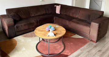 Deze bruine hoekbank is een ruime bank. De bank heeft een hoek aan de linkerkant. De stof is donkerbruin en heeft een lichte glans. Er zijn wat gebruikssporen te zien op de armleuningen en de zitting.