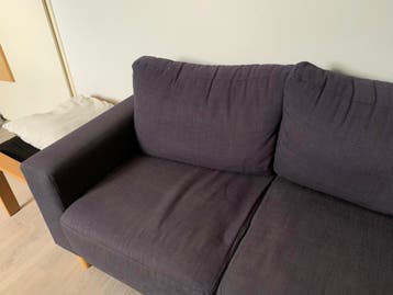 Een donkergrijze tweezitsbank met stoffen bekleding. De bank heeft twee zitkussens en twee rugkussens. De poten zijn van licht hout. De bank is gebruikt maar nog prima.