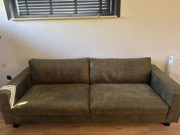 Deze comfortabele 3-zits bank is uitgevoerd in een stijlvolle olijfgroene leerlook. De bank is ongeveer 5 jaar oud en zit nog goed en de kussens zijn ook nog goed. Alleen hebben de katten aan de zijka