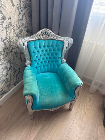 Leuke kinderbarokstoel, ideaal als opknapper voor een creatief project. Het frame is nog stevig, maar de bekleding kan een opfrisbeurt gebruiken. Perfect voor wie van knutselen houdt en er iets unieks