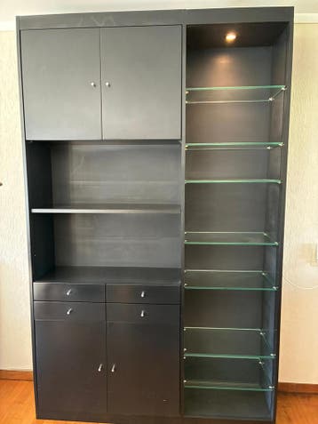 Afmeting hoogte 244 breedte 150 diepte 38 cm. Vitrine gedeelte heeft verlichting en glazen planken. Aan de achterzijde is wat waterschade aanwezig. Dit zit niet in het zicht wanneer de kast afgemontee