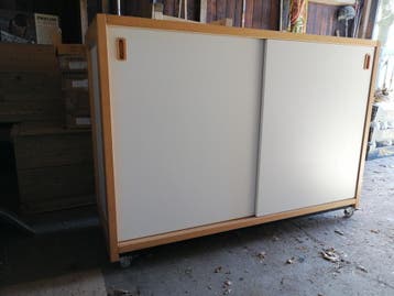 Oude schoolkast, vintage lengte 141 cm x diepte 51,5 cm hoogte zonder wieltjes 92,5 cm hoogte met wieltjes 99,5 cm (er af te halen) 2 schuifdeuren 6 flexibele losse planken