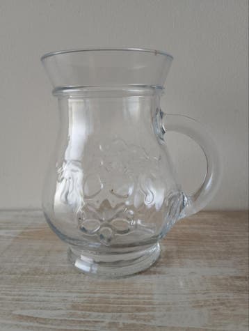 Leuk klein karafje, oor vaasje met gezellig bol buikje. Leuk voor stekken of een klein voorjaars boekje wilde bloemetjes op de onderkant staat nr 29. Hoogte 12 cm doorsnede bovenkant 7 cm buikomvang