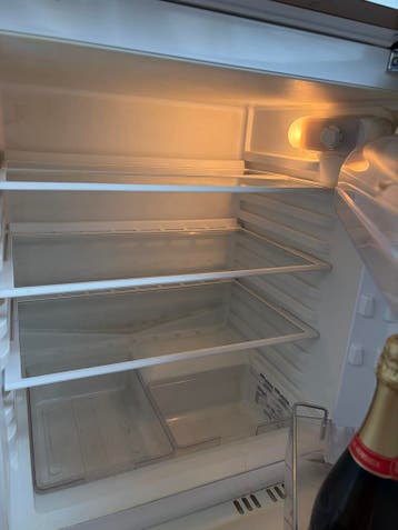 Een koelkast met een licht interieur en een paar planken. Er is ook een deurvak. De buitenkant is wit met een zilverkleurige handgreep als die met mag. Ook gratis op te halen- afzuigkap van ikea op te