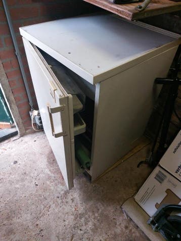 Oudje maar het werkt nog. Heeft altijd in de schuur gestaan makkelijk met tuinfeestjes deur sluit niet best meer maar is volgens mij makkelijk aan te passen. Breedte ca 56 cm hoogte ca 85 cm wel nog e
