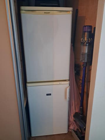 Een witte exquisit tafelmodel koelkast. De koelkast heeft glazen planken en er zijn ook vakken in de deur. De koelkast is van binnen en buiten te zien op de foto's.