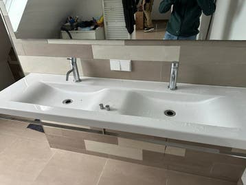 Is al los gehaald staat al beneden deze dubbele wastafel is wit en heeft twee kranen. Er zit een handdoekrek onder de wastafel. De wastafel is breed en heeft twee afvoeren.