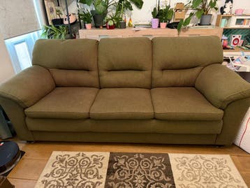 Bruine driezitsbank. Stevige zitsplaatsen, materiaal is wat verkleurd door de zon maar zit nog prima. Moet zo snel mogelijk weg ivm verhuizing. 210Cm lank, 85cm diep, 88cm hoog.