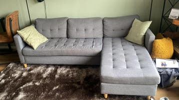Deze bank is goed gebruikt en heeft wat gebruikssporen. Er zitten losse halen in de stof en op sommige plekken is de stof een beetje gescheurd. Desondanks kan de bank nog prima een ronde mee, bijvoorb