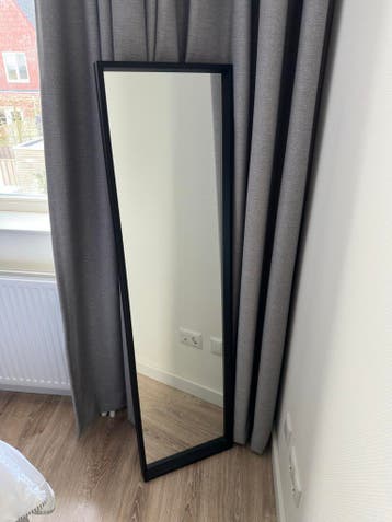 Een zwarte spiegel, staand tegen de muur of ophangen. De spiegel heeft een slank, rechthoekig ontwerp en een zwarte rand. Het is een eenvoudige, functionele spiegel. Alleen ophalen mogelijk voor aanst