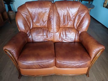 Een bruine leren tweezitsbank. De bank heeft een klassieke uitstraling met houten armleuningen en poten. Het leer heeft wat natuurlijke plooien.