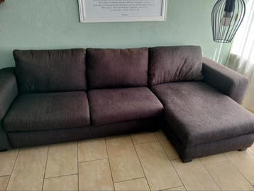 Gratis af te halen: een gebruikte hoekbank in een donkergrijze stof. De bank is nog comfortabel en functioneel, maar is gebruikt .
