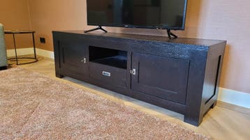 Mooie tv meubel die helaas niet in ons nieuwe huis past. Met twee kastjes, een lade en een open vak. L x b x h = 162,5 x 44 x 52 cm