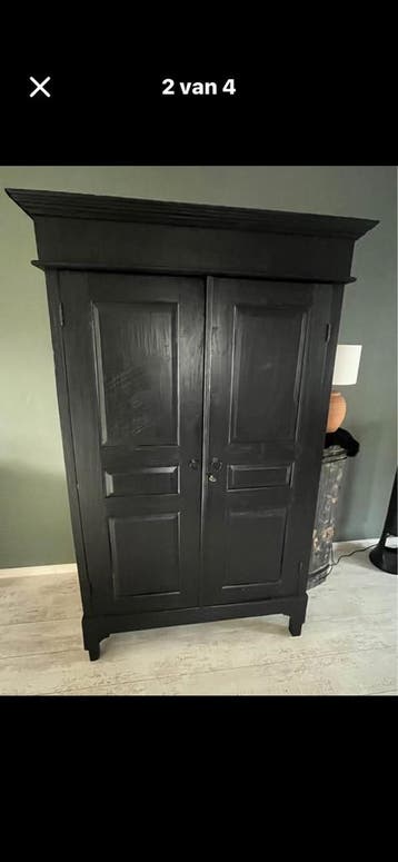 Gratis! Prachtige oude zwarte kast met degelijke houten kastplanken. Deur kan nagenoeg dicht maar niet helemaal; is niet storend maar daarom niet mogelijk om op slot te draaien (hout werkt nu eenmaal,