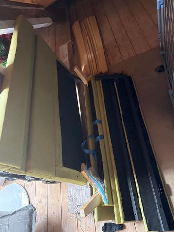 Groene bed ombouw met led verlichting in het hoofdbord. Het bed is gedemonteerd en de lattenbodems zijn ook aanwezig. Het is een eenpersoonsbed