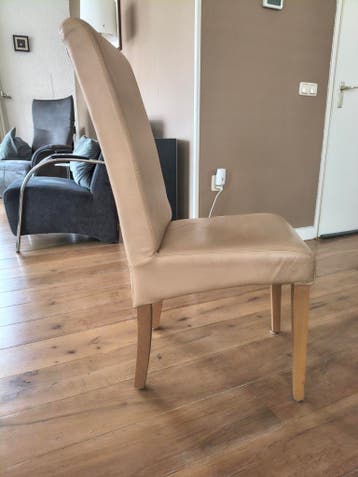 Een leren eetkamerstoel in prima conditie. De stoel heeft een lichte kleur en houten poten. Prima conditie. Twee stuks.