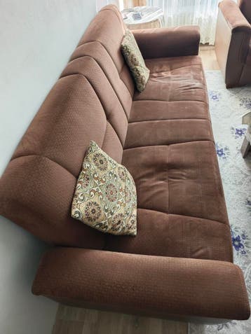 Een bruine 3-zitsbank + 2-zitsbank. De bank heeft een gestoffeerde bekleding en is in gebruikte staat. Direct gratis op te halen