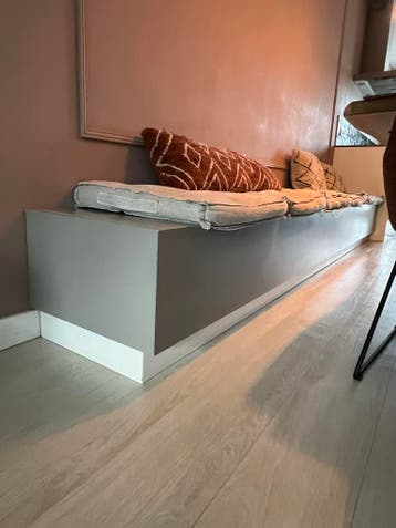 Deze eetbank is door een interieur bouwer gemaakt. De bank is grijs met een witte plint aan de onderkant. De zitting kan op 3 punten omhoog, waardoor er opbergruimte onder is. De hoogte is 40 cm, de d