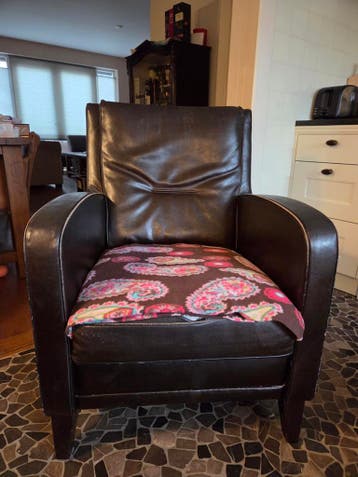 Zitting helaas het leer op kapot. Wij hebben dat opgelost door er een fleece kleedje op te leggen (niet inbegrepen). Stoel zit heerlijk.