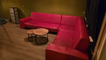 Deze rode hoekbank van kunststofleer is gratis af te halen. De bank is gebruikt en heeft wat gebruikerssporen. Hij is nog prima te gebruiken, maar moet wel snel weg.