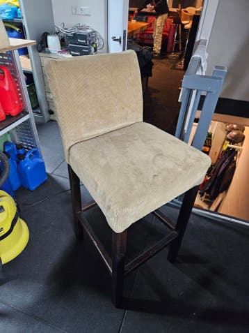 Twee barkrukken met stoffen bekleding. De krukken hebben een donkerbruin houten onderstel en een voetsteun. De stof is lichtbeige van kleur.