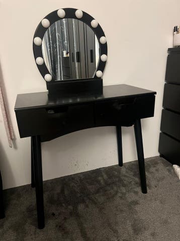 Zwarte kaptafel met twee lades en een ronde spiegel. De spiegel heeft verlichting rondom. Alleen verlichting doet niet meer.