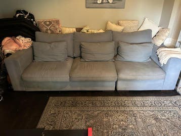 Grote grijze bank met drie zitplaatsen. De bank heeft een stoffen bekleding en komt met bijpassende kussens. De bank is gratis af te halen.
