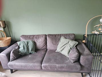 Comfortabele antracietkleurige tweepersoonsbank, ideaal voor kleinere ruimtes of als aanvulling op uw zithoek. De bank is gebruikt, maar verkeert nog in goede staat en biedt een fijne zitplek. Perfect