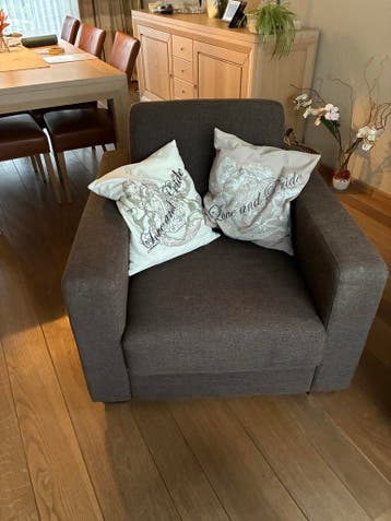 Een nette 1-persoons bank in een donkere stof. De bank is in zeer goede staat en heeft een strakke vormgeving. Ideaal voor een kleinere ruimte of als extra zitplek.