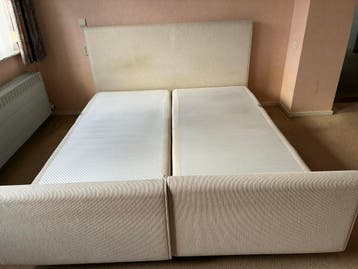 Een tweepersoonsbed met een lichtbeige stoffen ombouw en hoofdbord. De bedbodems zijn elektrisch verstelbaar. Het bed is in gebruikte staat, zoals te zien op de foto's.
