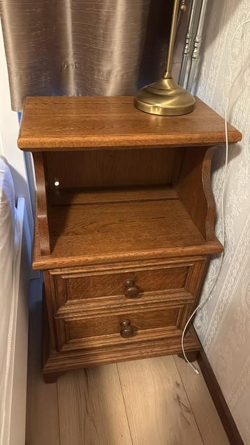 Dit klassieke nachtkastje, gemaakt van stevig hout, is een charmante toevoeging aan elke slaapkamer. Het beschikt over een handige lade voor het opbergen van persoonlijke spullen en een open vak voor