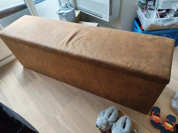 Handige opbergbank of voetenbank in bruine stof. Ideaal voor extra opbergruimte in de woonkamer, slaapkamer of hal. De bank is gebruikt en heeft enkele lichte gebruikssporen op de stof, maar is verder