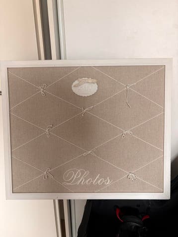 Een fotobord met een linnen achtergrond en witte touwtjes om foto's achter te steken. Er staat 'photos' op en een klein bordje met 'sweet home'. De lijst is wit.