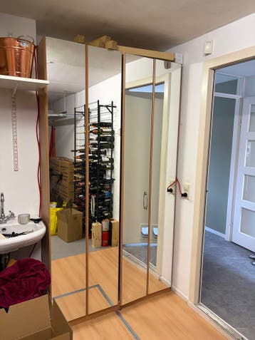 Ruime kledingkast met drie spiegeldeuren. De kast is voorzien van meerdere planken en een hanggedeelte, ideaal voor het opbergen van kleding en accessoires. De spiegeldeuren zijn praktisch en laten de