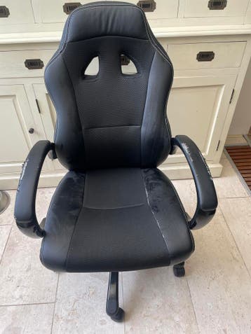 Gratis af te halen: een gebruikte bureaustoel/gamestoel. De stoel is nog functioneel, maar heeft duidelijke schade aan de leuningen, en slijtage op het zitvlak, zoals te zien op de foto's. Ideaal
