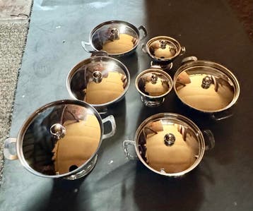 Een 7-delige gero zilmeta soep terrine set. De set bestaat uit een grote terrine en zes kleinere kommen, allemaal met deksel. Ziet er nog netjes uit.