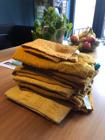Een stapel gebruikte handdoeken en theedoeken in verschillende tinten geel. Handig voor diverse klusjes of als extra set.