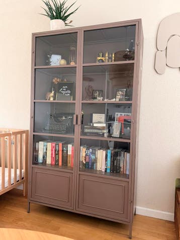 Metalen kast van woood (ronja). Afmetingen: h 189 x b 110 x d 43 cm. Originele kleur zwart, zelf overgespoten mat taupe. Achterkant niet dekkend. Bevat gebruikerssporen. Originele prijs 599 euro. Mag