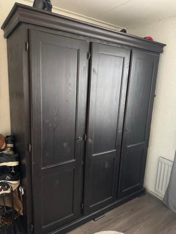 Kledingkast in donkerbruin in gebuikte staat. De kast heeft drie deuren. Binnenin is er ruimte voor kleding. 100Cm voor dubbel hang. De stangen zijn wat doorgezakt en zullen vervangen moeten worden. D