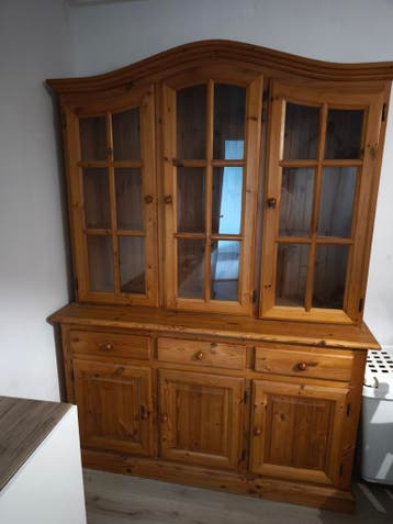Mooie grenen buffetkast met een klassieke uitstraling. De bovenkast heeft drie glazen deuren, ideaal voor het tentoonstellen van servies of decoratie. De onderkast is voorzien van drie lades en drie d