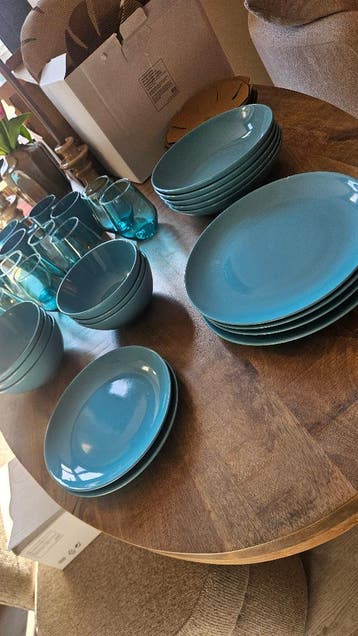 4 grote borden(waarvan 1 kleine beschadiging zie foto) 5 diepe borden 6 soepkommen 2 dessert borden 8 waterlagen 6kopjes alles bij elkaar, ophalen voorburg