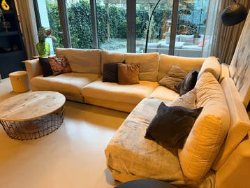 Gratis een grote hoekbank bestaande uit 4 losse delen. Ideaal voor een ruime woonkamer. De bank is goed gebruikt. Hoezen kunnen gewassen worden. 1 Zitting is versleten. Hadden wij een plaid overheen.